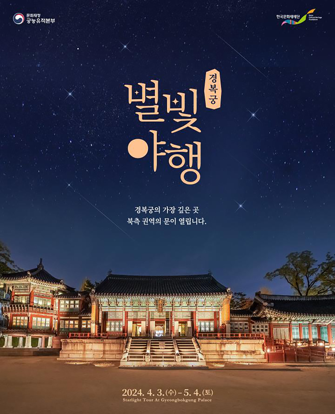 경복궁에서는 조선시대 궁중의식을 체험하고 경복궁의 아름다운 야경을 감상할 수 있는 「2024 경복궁 별빛야행」행사를 개최합니다. 이 행사는 2024년 4월 3일부터 5월 4일까지 매주 수요일부터 일요일까지 진행되며, 하루에 두 차례로 운영됩니다.