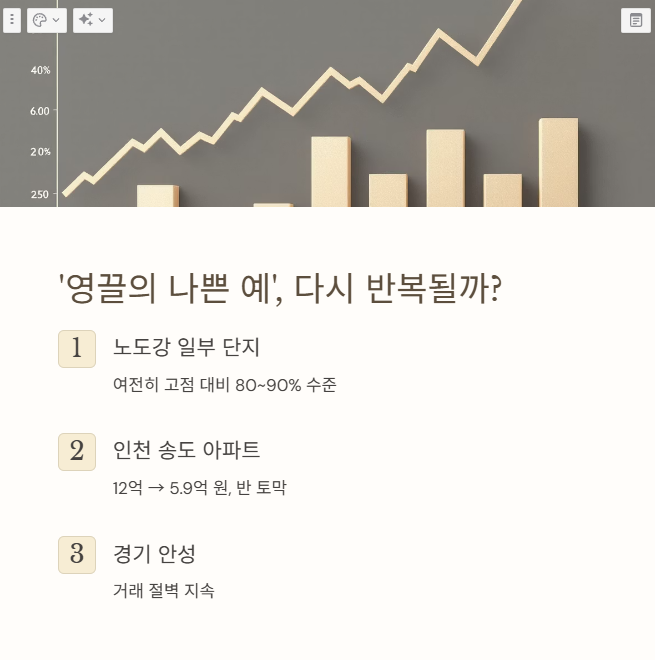 - 노도강 일부 단지: 여전히 고점 대비 80~90% 수준
