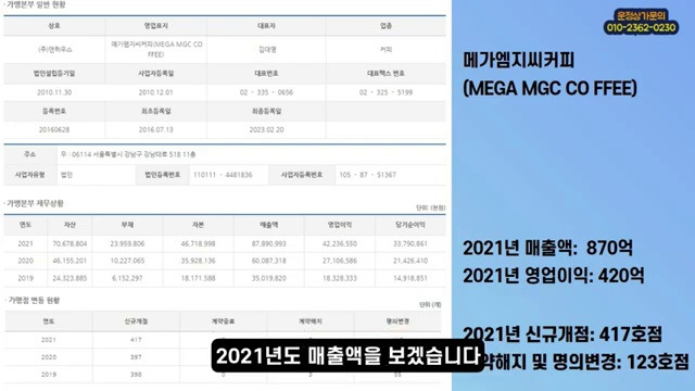 - 메가커피의 2021년 매출액은 870억 원이다.