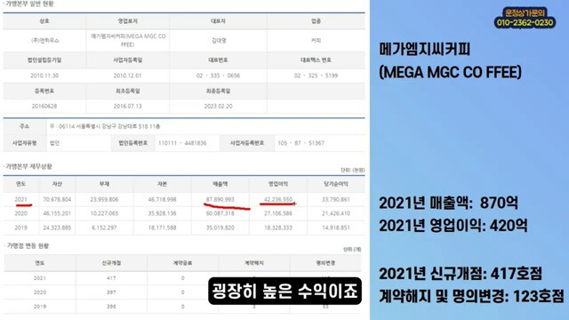 메가커피의 매출과 수익성에 대한 부분도 흥미로웠어요. 2021년 기준으로 메가커피의 매출액은 870억 원, 영업이익은 420억 원으로 굉장히 높은 수익을 자랑한다고 해요. 특히, 2021년 신규 개점이 417호점으로, 하루에 한 개 이상의 매장이 오픈한 셈이라고 하니 그 성장세가 대단하죠. 평균 매출액은 3억 2천 8백만 원, 월 매출액은 2,733만 원이라고 해요. 하지만 이 금액이 순수익은 아니기 때문에, 제로비, 인건비, 임대료 등을 제외하고 나면 순수익은 약 530만 원 정도가 나온다고 합니다.