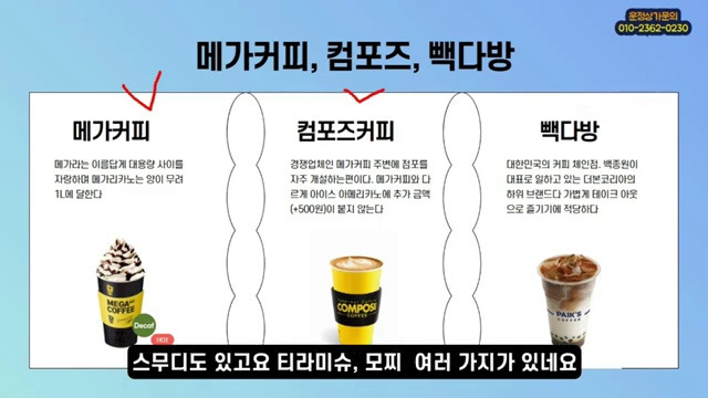 영상에서는 저가 커피 시장이 여전히 성장하고 있지만, 경쟁이 치열하다는 점도 강조했어요. 명의 변경이 꾸준히 일어나고 있다는 점에서 고점을 찍었다는 인식을 주고 있지만, 커피 시장 자체가 테이크아웃 문화로 자리 잡았기 때문에 계속 성장할 가능성이 있다고 해요. 다만, 진입장벽이 낮아 많은 경쟁업체가 생길 수 있으니, 이 부분도 잘 고려해야 한다고 했어요.
