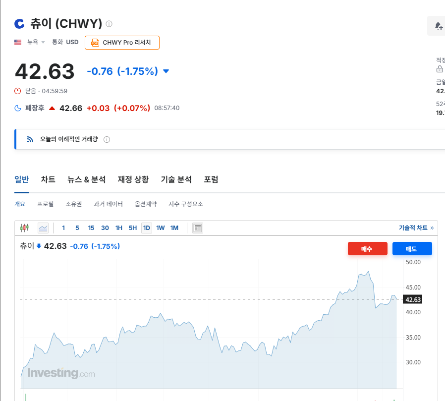 25일(현지시간) 기준, 츄이의 종가는 약 42.6달러.